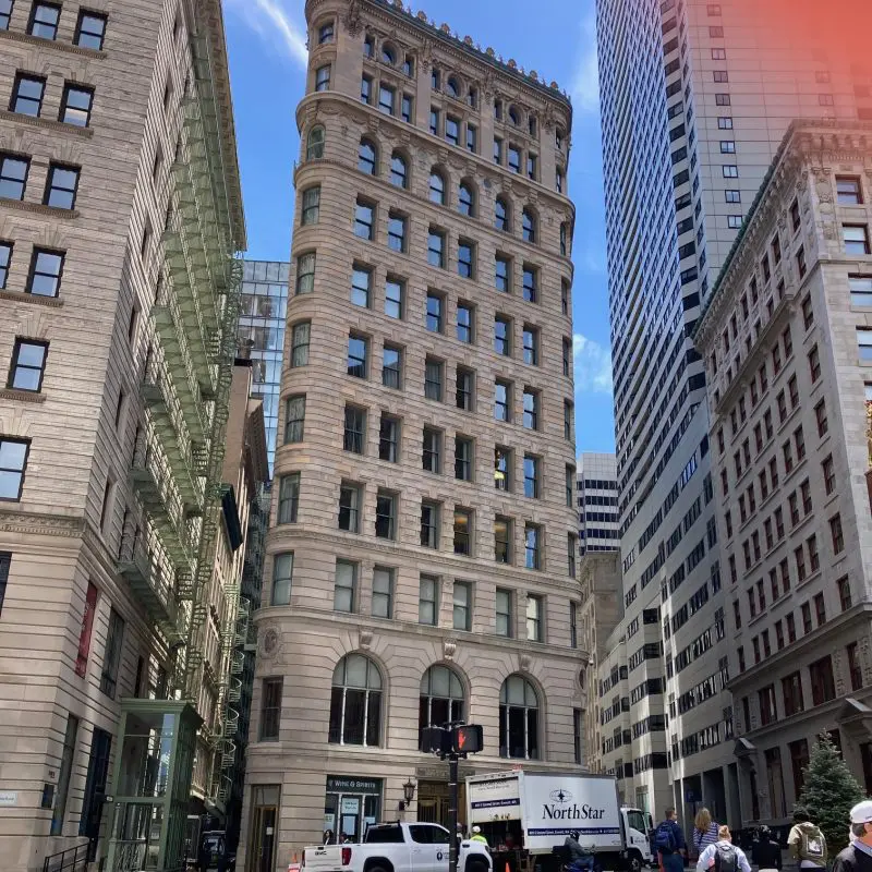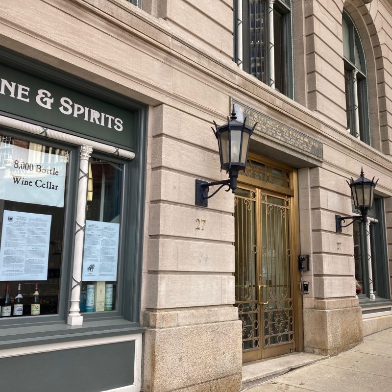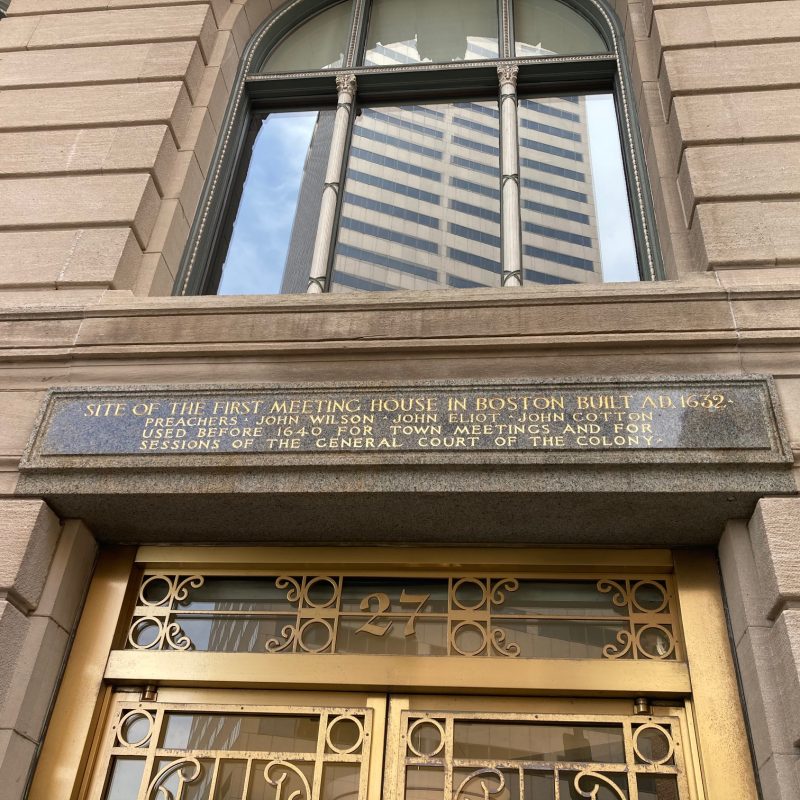 A plaque memorializing the location of the 1630s church is above the door at 27 State Street. (The present-day church is at 66 Marlborough Street.)