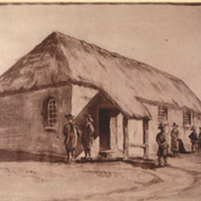 One of the first buildings erected by the Puritans after the founding of Boston in 1630 was their meeting house. The meeting house was built of wood with a thatched roof on a site now located on State Street. A second meeting house was built close by, in Cornhill Square near the town house, in 1640. After a fire burned that building to the ground in 1711, a brick building was constructed on the same site. A fourth meeting house was built in 1807, at Chauncey Place, near the corner of Washington and Summer Streets. Finally, the fifth meeting house was located on Marlborough Street, at Berkeley, in 1868. In 1968, a fire destroyed that 100-year-old building and a new one was built in 1972. The First Church remains in this location today, and is Unitarian Universalist.