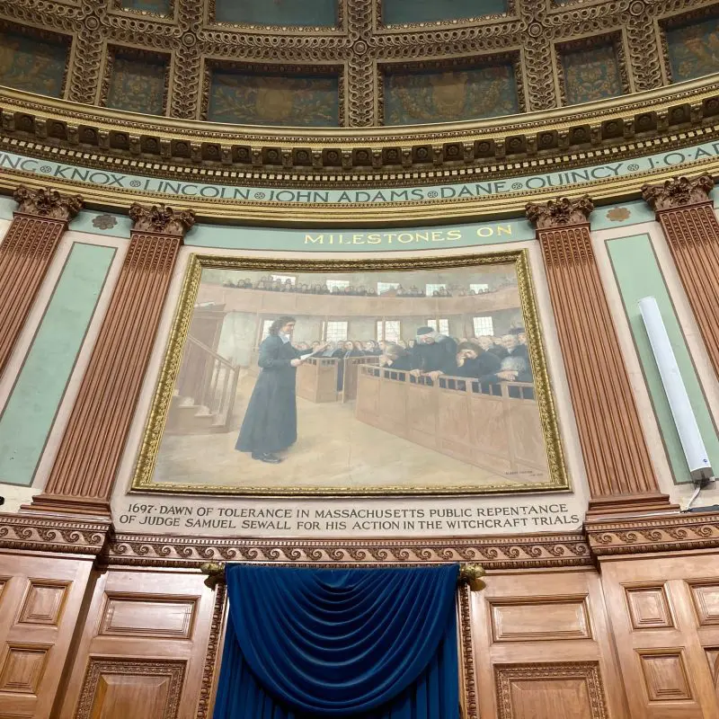 In 1697, Judge Samuel Sewall stood before the congregation at South Church while his minister, Rev. Willard, read Sewall’s apology for his part in the witch trials. Sewall is the only judge known to have apologized publicly. A mural depicting this event is displayed in the House Chamber of the Boston State House today. It was painted by Albert Herter in 1942.