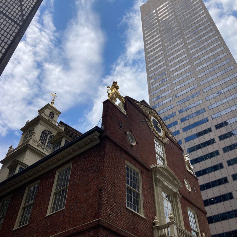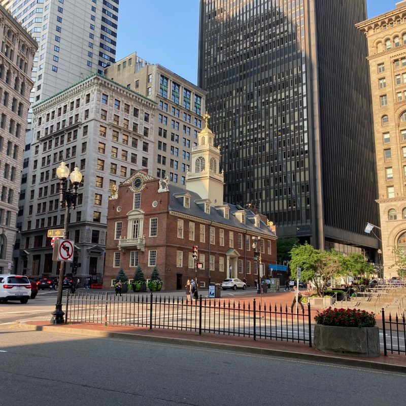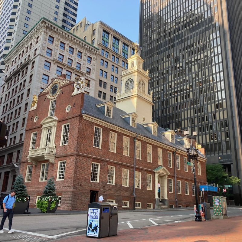 The Old State House was the seat of both colonial and state governments of Massachusetts. Constructed in 1713, it is the oldest surviving public building in Boston. In the square in front of the building, in March of 1770, British soldiers fired upon colonists, killing five and wounding many more, an event that came to be known as the Boston Massacre. Six years later, in July of 1776, Bostonians gathered below the building’s balcony to hear the reading of the Declaration of Independence. This building remained the seat of Massachusetts government until 1798, when the new State House, designed by Charles Bulfinch, was built on Beacon Hill.
