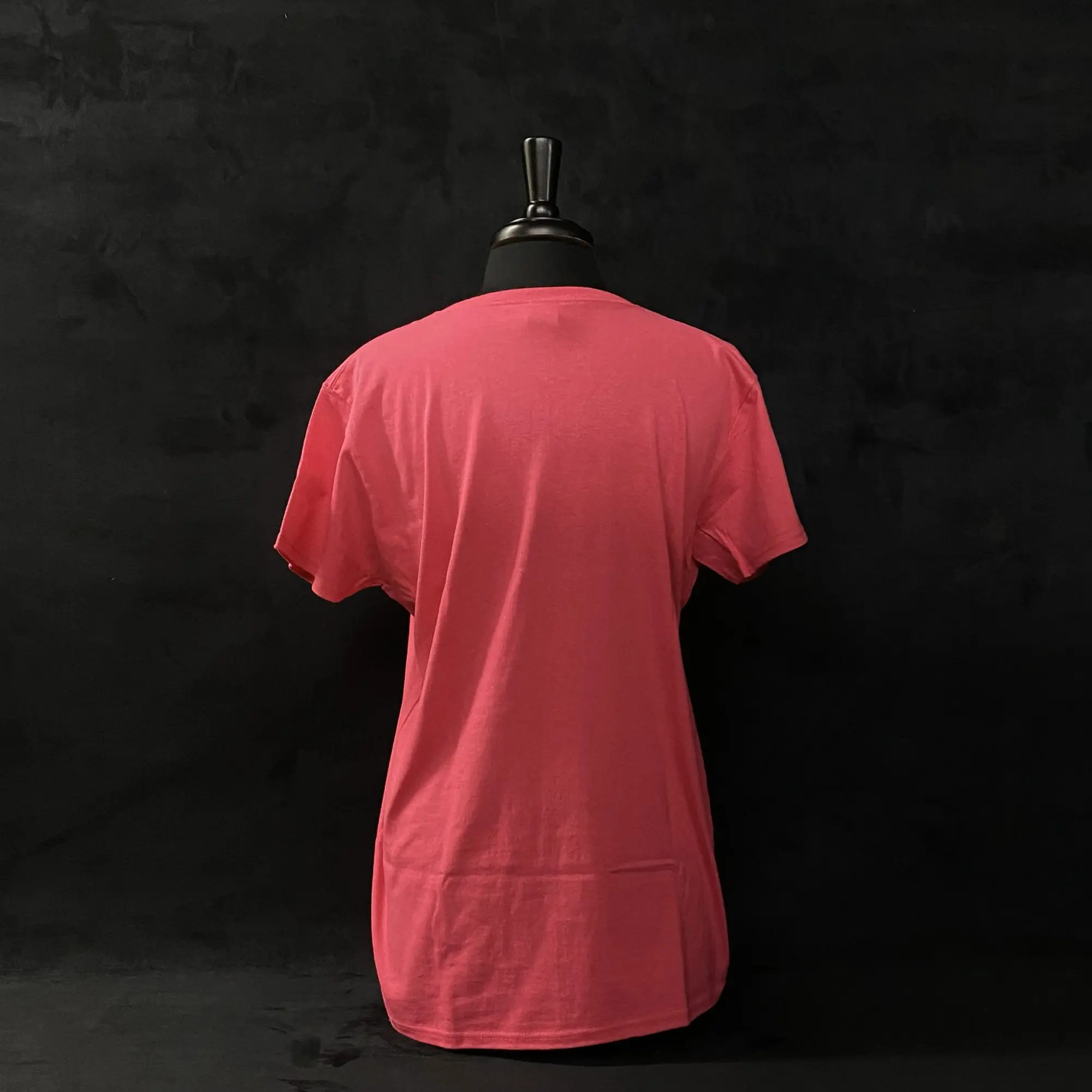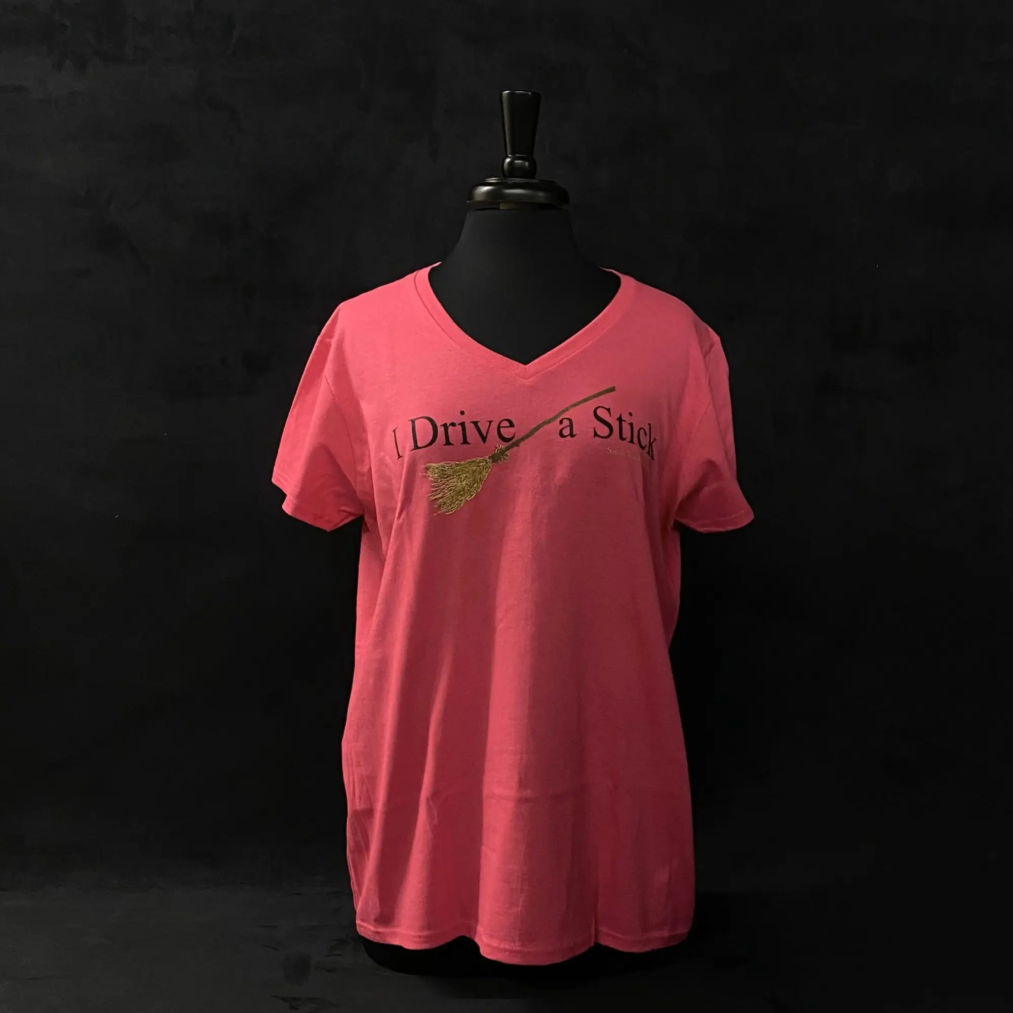 100% cotton t-shirt printed with the phrase “I Drive a Stick”. The words are bisected by a flying witch’s broom. This punny shirt is hot pink and features stylish cap sleeves, crew neck, and is fitted. Material is thin and soft. Machine washable.
